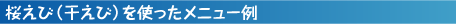 | (桜えび)かき揚げ・お好み焼きなど。(干しえび)洗いすぎると、干しえびのうまみが洗い流されてしまうので、軽く洗います。〈そうめんのつゆに・・・〉皮を剥いて水又は酒で戻し、こんぶと併用して使います。だしをとったエビは、そうめんの具にします |