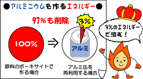 アルミカンからアルミをつくる場合、ボーキサイトからつくるのに比べ