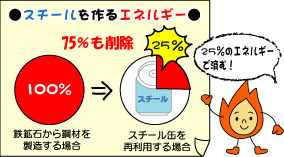 スチールカンから再生する場合は、鉄鉱石から鋼材を製造する場合よりもエネルギー消費量は、