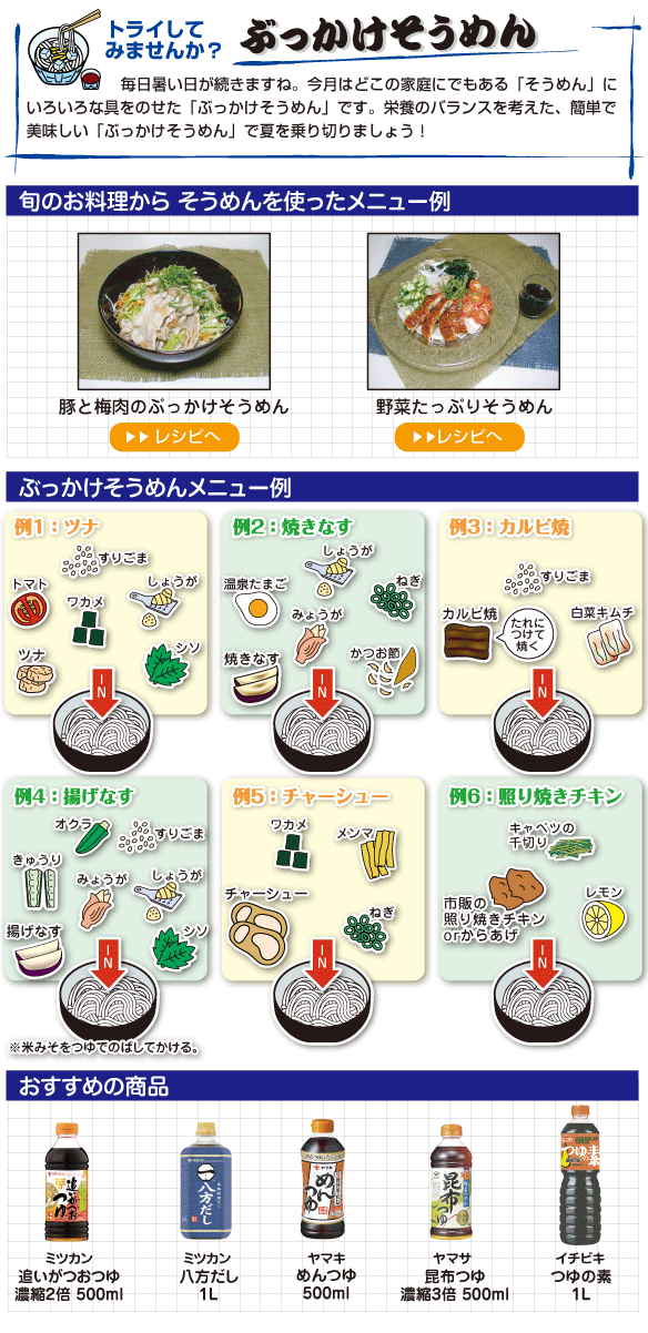 野菜たっぷりそうめんのレシピへ豚と梅肉のぶっかけそうめんのレシピへ野菜たっぷりそうめんのレシピへ豚と梅肉のぶっかけそうめんのレシピへ